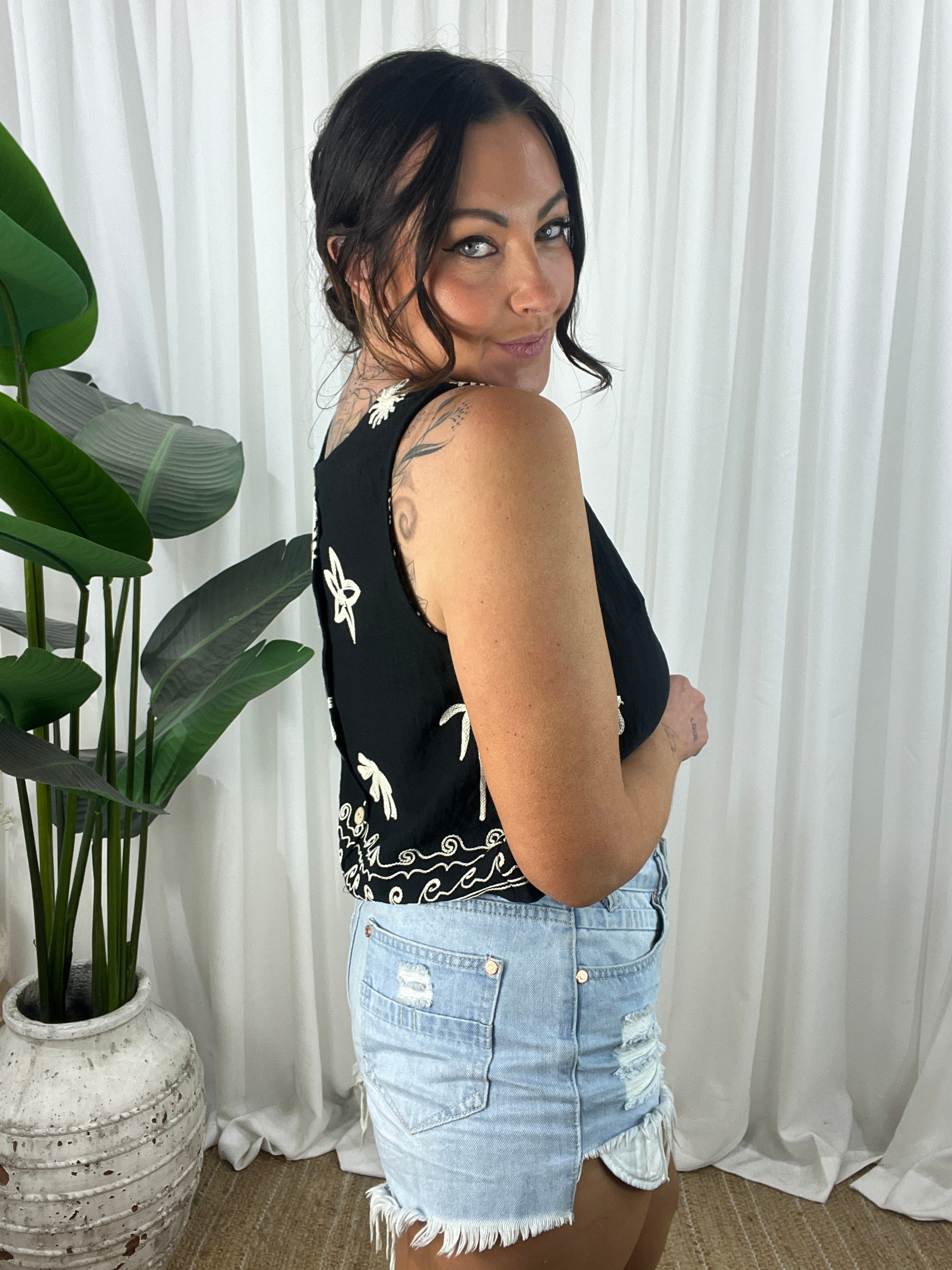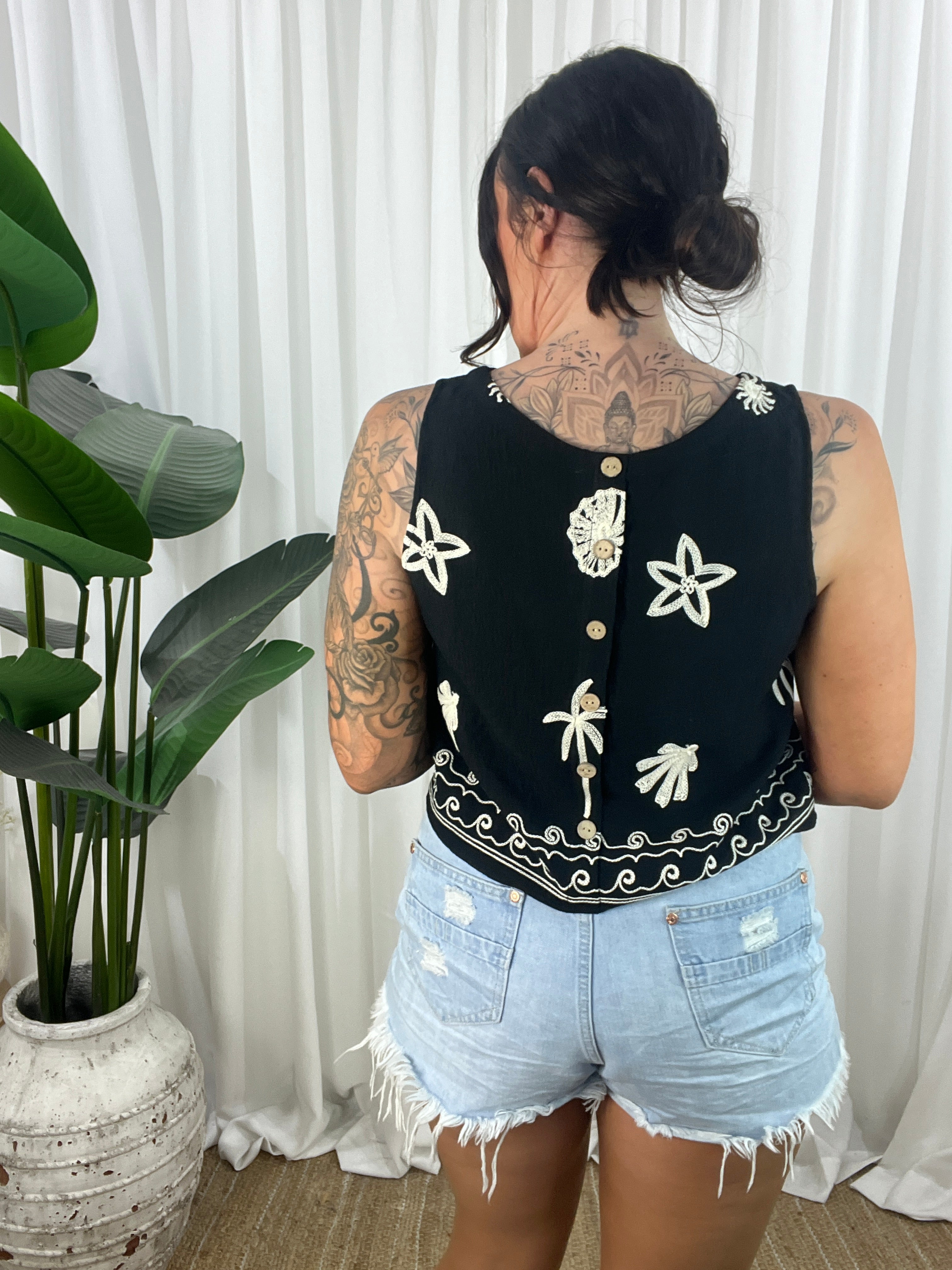 - Embroided Detail: Black base with a cream embroided summer scene pattern