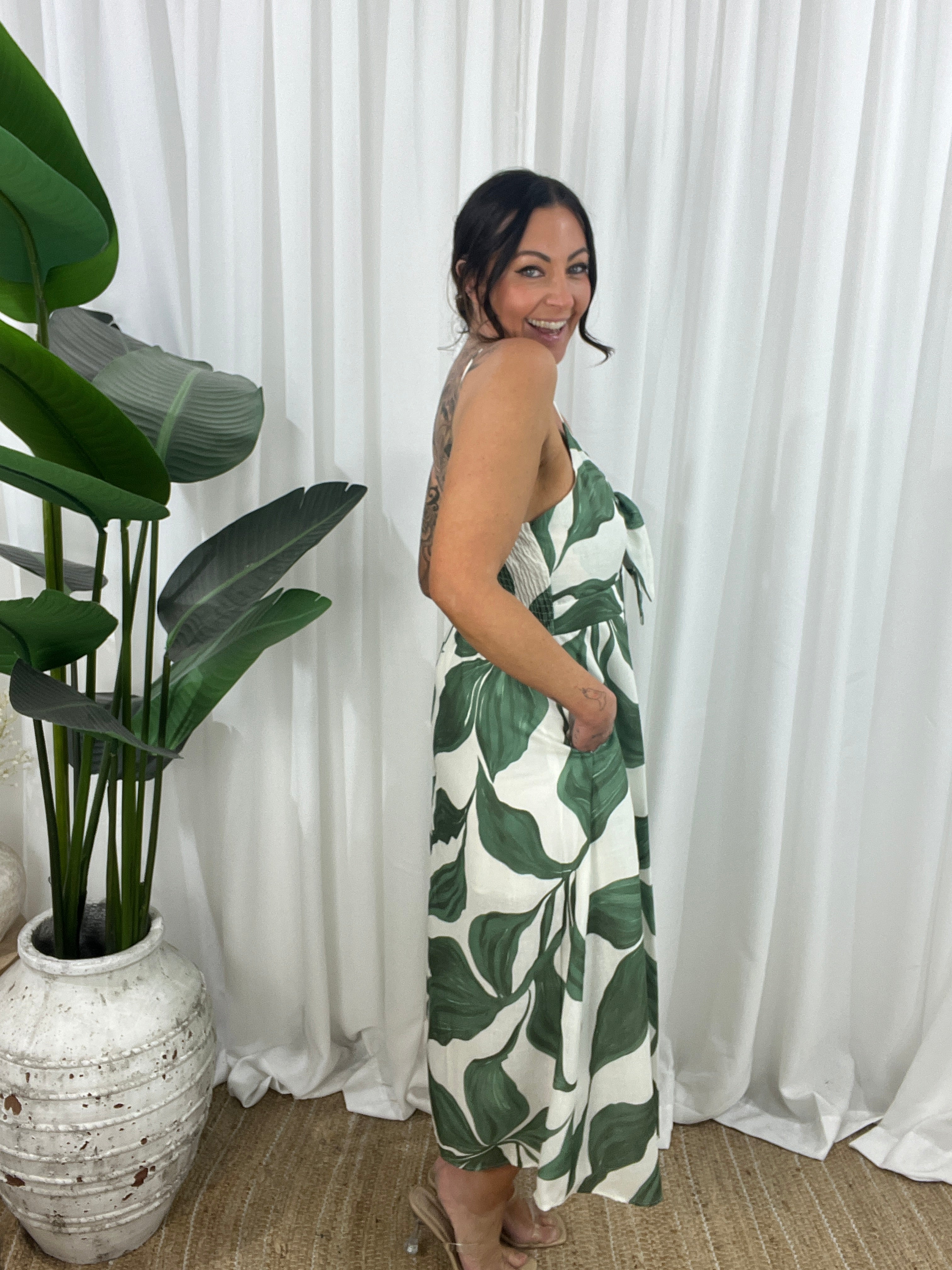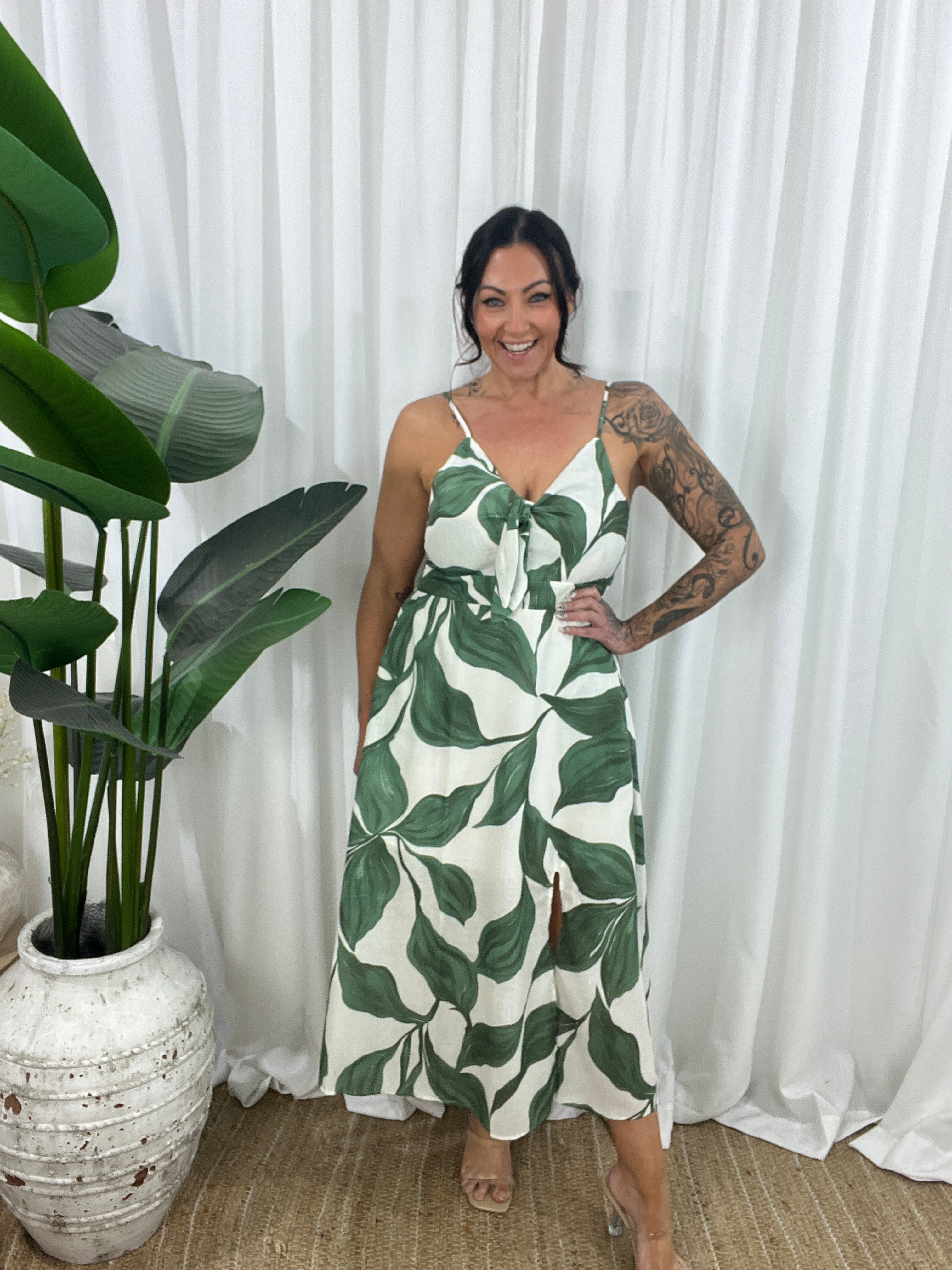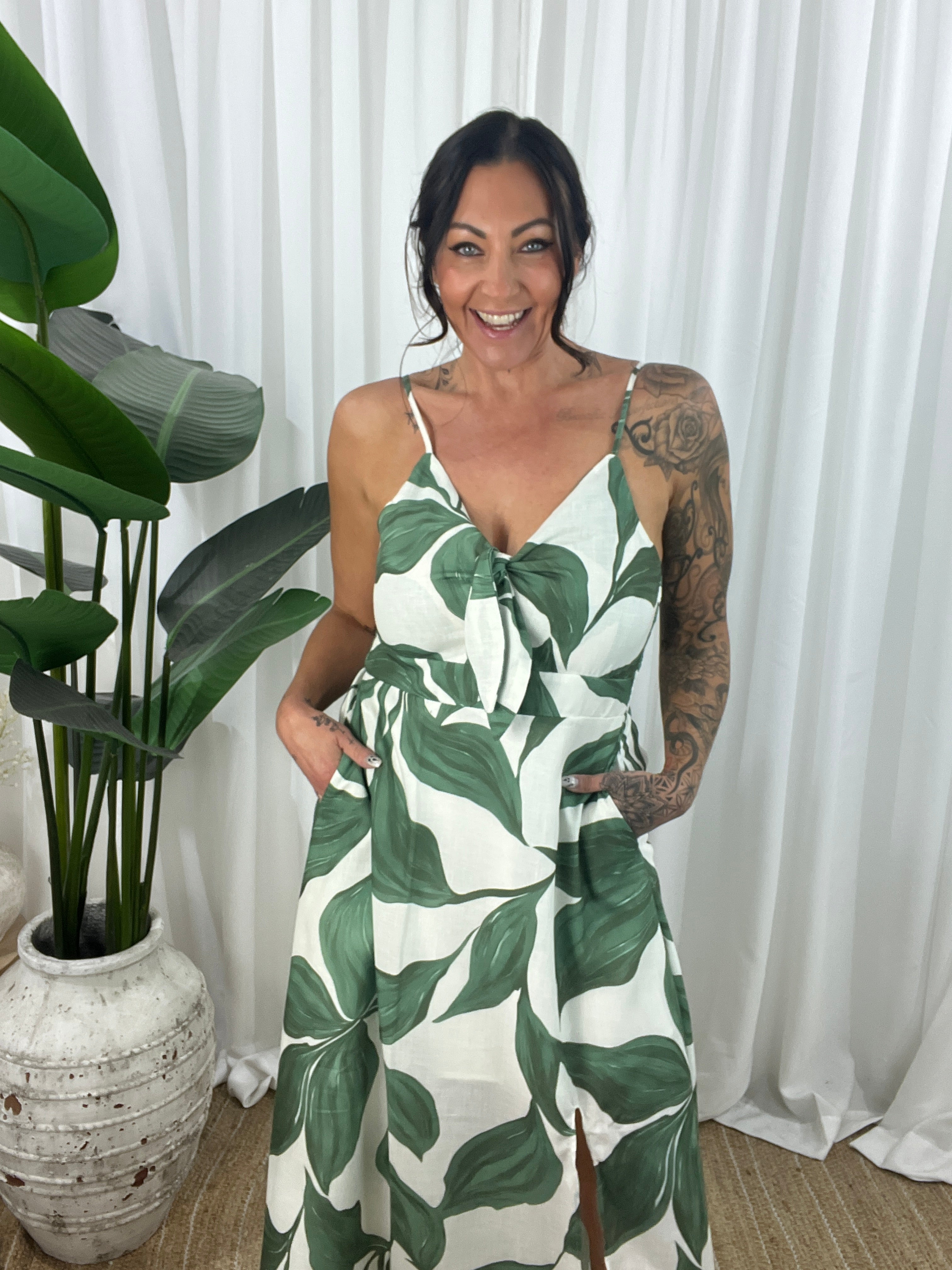 Sun-drenched and effortlessly chic—the Vaga Midi Dress brings vintage leaf vibes to your everyday escape. Crafted from a breathable linen blend, this fully lined midi features a peek-a-boo tie front bodice, thick straps for bra coverage, and a flattering A-line silhouette that flows with ease.
